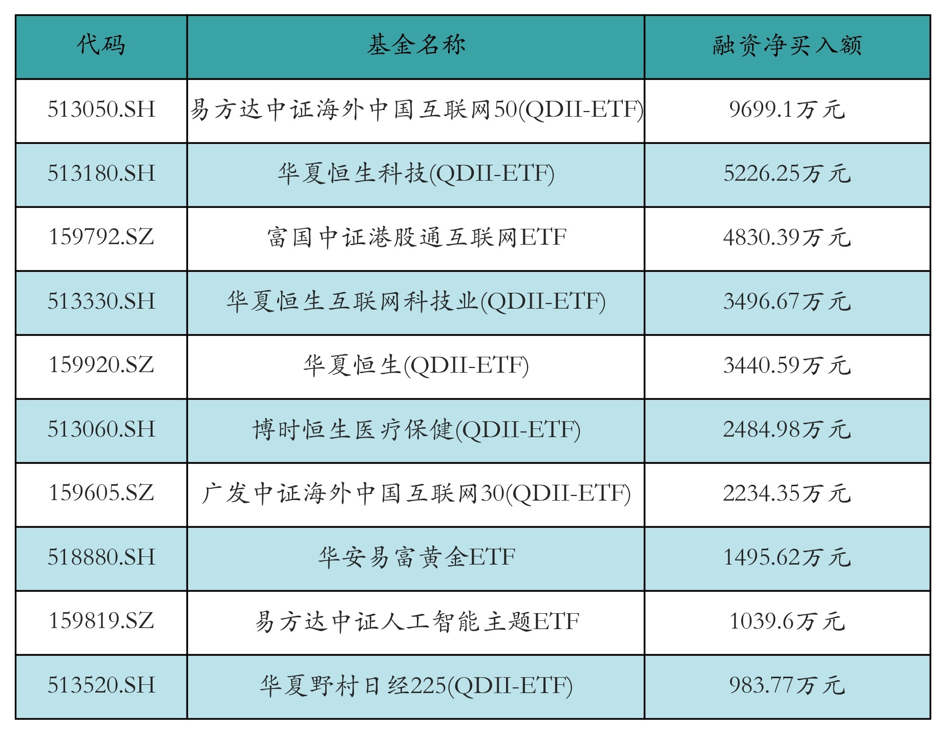 1月7日ETF融资净买入额前三位诀别为:易方达中证国际中国互联网50(QDII-ETF)(9699.1万元)、中原恒生科技(QDII-ETF)(5226.25万元)和富国中证港股通互联网ETF(4830.39万元),前10具体见下表: