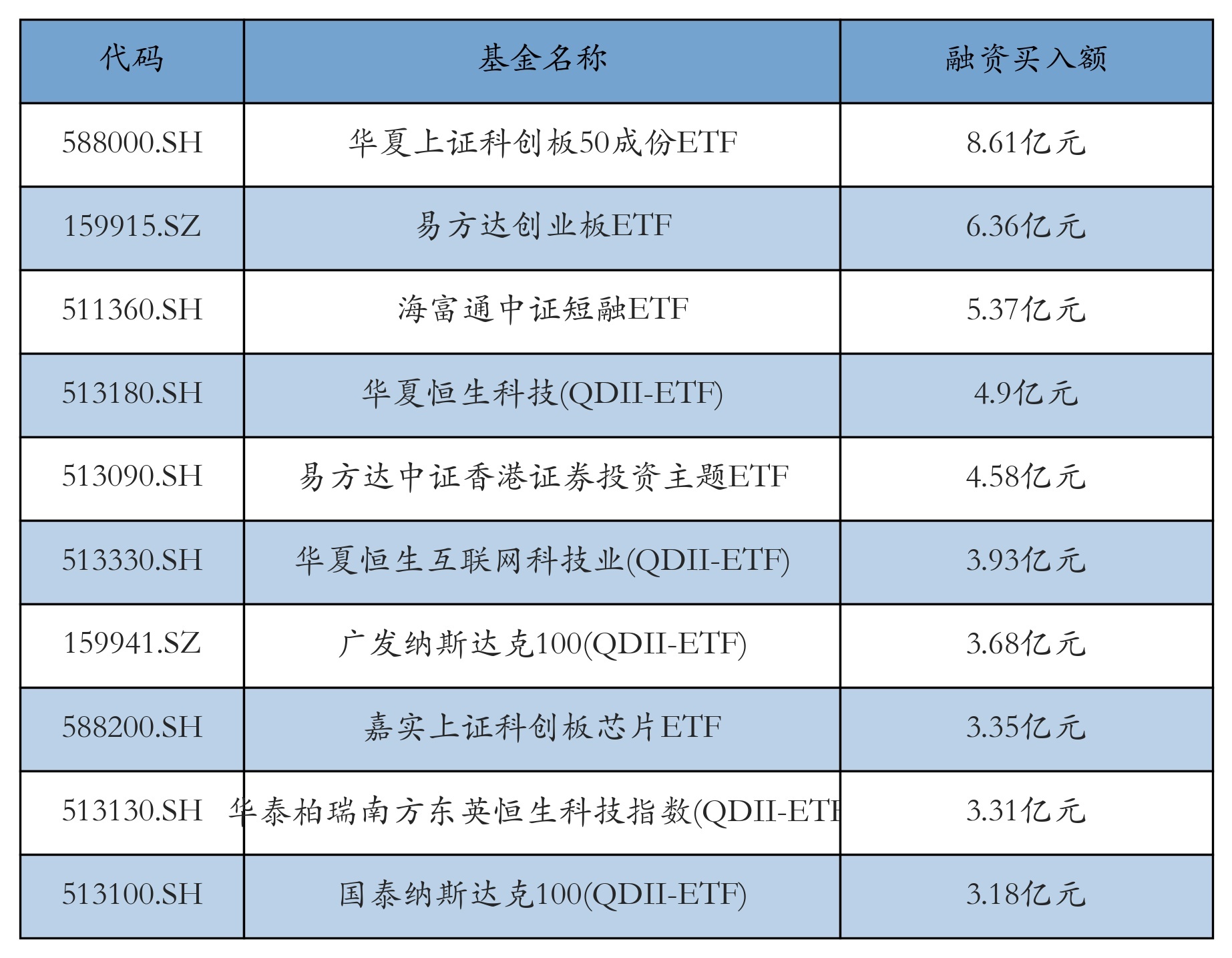 1月7日ETF融资买入额前三位诀别为:中原上证科创板50成份ETF(8.61亿元)、易方达创业板ETF(6.36亿元)和海富通中证短融ETF(5.37亿元),前10具体见下表: