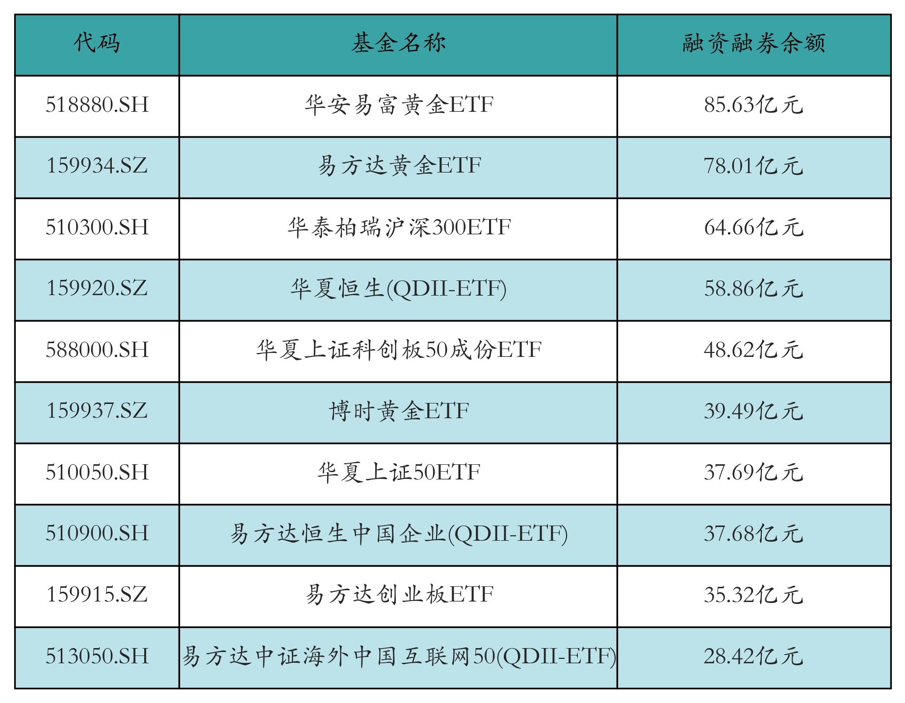 1月7日ETF两融余额前三位诀别为:华安易富黄金ETF(85.63亿元)、易方达黄金ETF(78.01亿元)和华泰柏瑞沪深300ETF(64.66亿元),前10具体见下表: