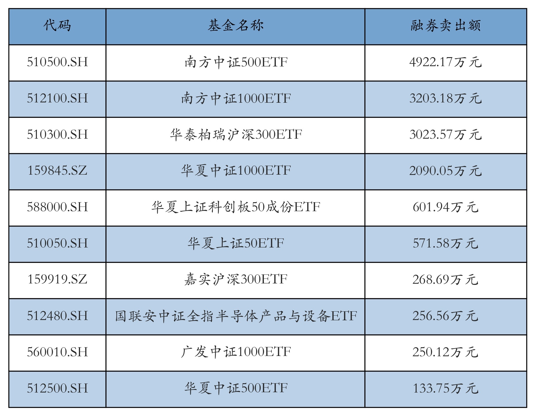 1月7日ETF融券卖出额前三位诀别为:南边中证500ETF(4922.17万元)、南边中证1000ETF(3203.18万元)和华泰柏瑞沪深300ETF(3023.57万元),前10具体见下表: